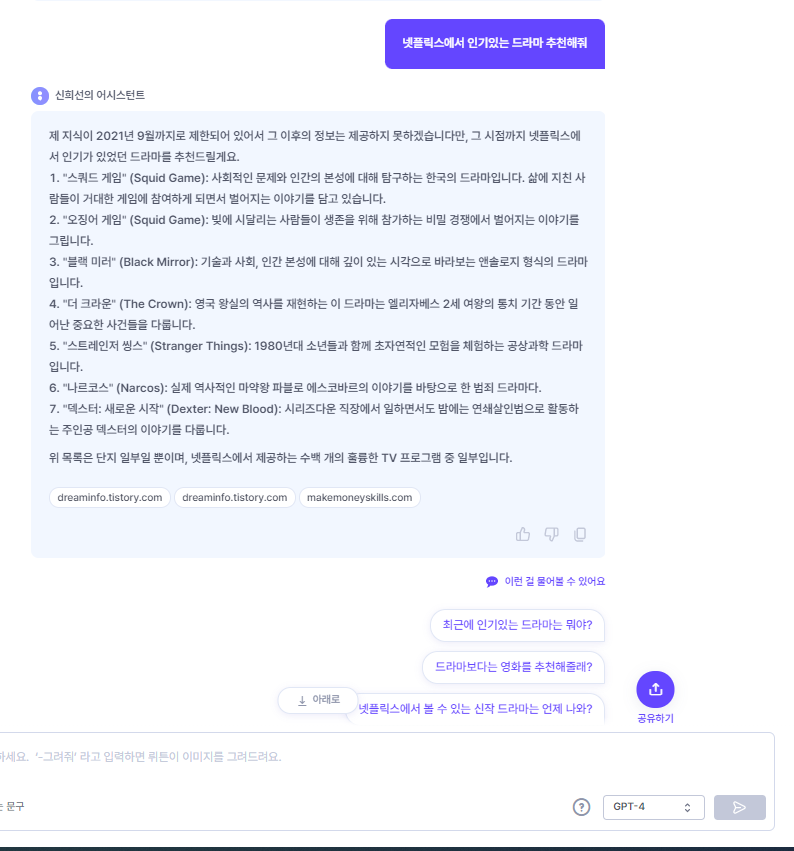" 넷플릭스 인기 있는 드라마 추천해 줘"라고 질문을 해보았습니다.